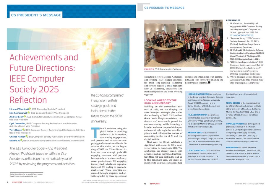 IEEE ComputerSociety’s 2025 Reflection article in Dec issue of Computer magazine. Together with Vice Presidents, we reflected on remarkable year of 2025 by reviewing the programs and activities, and look ahead to the future toward the 80th anniversary!
