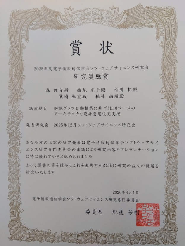 論文「知識グラフ自動構築に基づくLLMベースのアーキテクチャ設計意思決定支援」IEICE SIGSS研究奨励賞